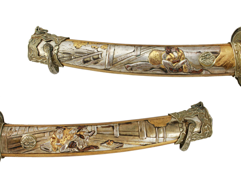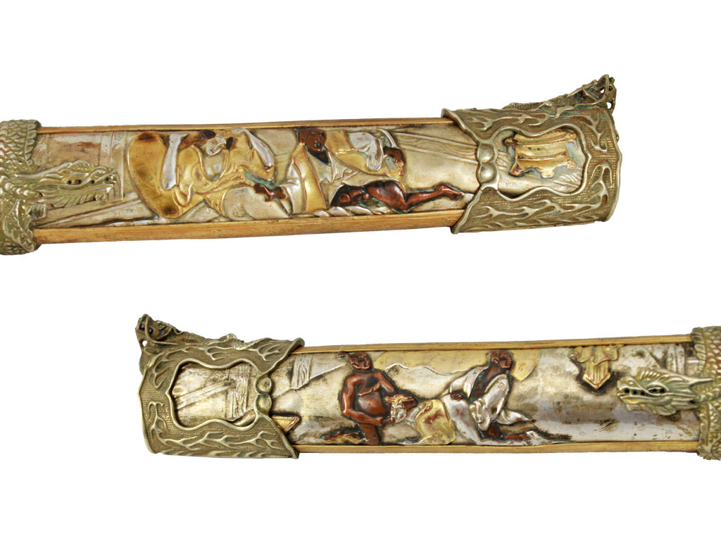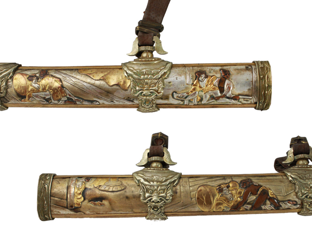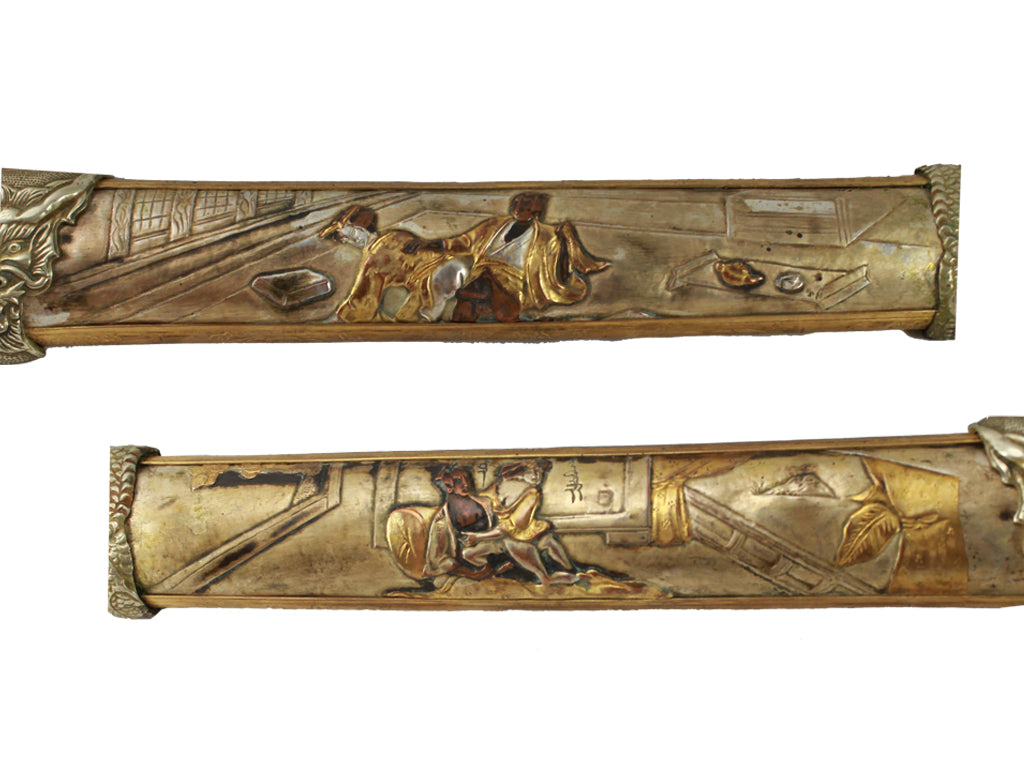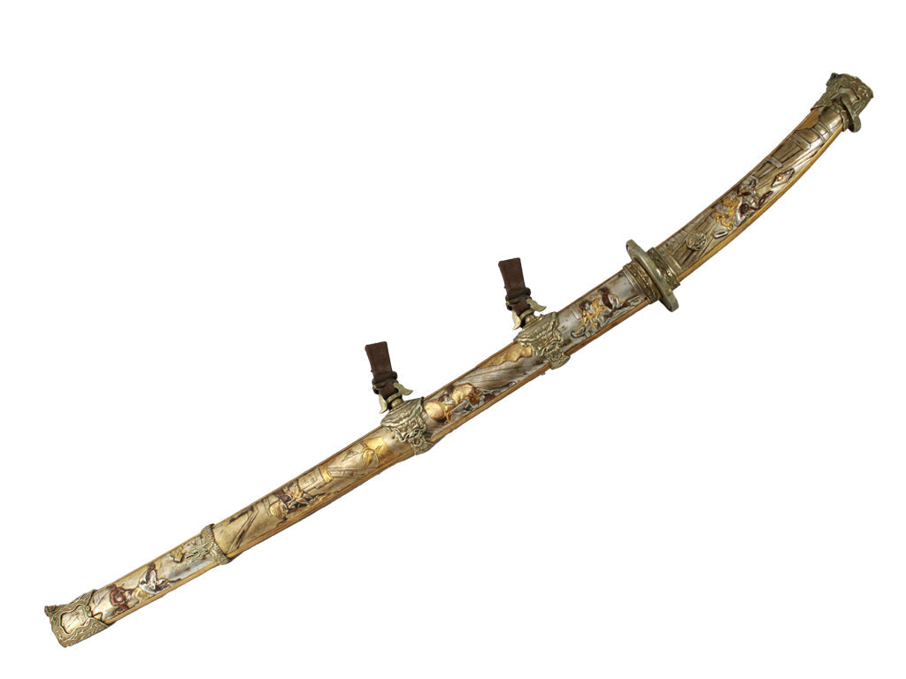 Depicted throughout this hand-crafted sword are the various positions of the Kama Sutra engraved throughout the saya and handle. This LIMITED EDITION Tachi features gold, silver and bronze accents and a ceremonial handle. The blade is hand forged from high carbon steel using traditional Japanese forging methods passed down from each generation to the next. The saya and handle is accented with genuine gold, silver, copper and bronze.