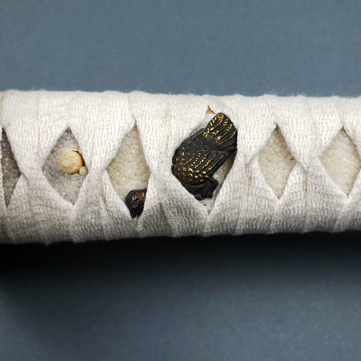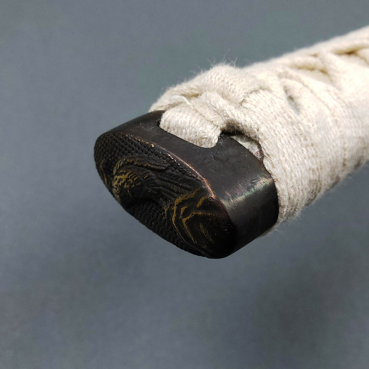 From the Musashi Gold Collection comes this intricately hand crafted Umi Katana. Hand forged using 1045 & 1060 steel using the traditional Japanese method of Kobuse-kitae. This method uses a soft steel core in a hard steel jacket to improve overall shock absorption while cutting through hard materials. The blade hardness is 58HRC. The handle is ray skin wrapped in traditional white cotton cord. It also features an oxidized brass tsuba and fittings. Included with this katana is a maintenance kit to make sure your katana lasts a lifetime as well as a beautifully crafted sword box.